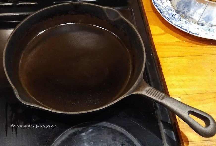You can see in the first skillet picture what I mean by “well seasoned” – it looks pretty slick. I use no extra oil when I fry meat in it unless it is wanted for flavour. I get it hot first to sear the surfaces of what I am cooking and, if left long enough before attempting to turn, it rarely sticks. I fry eggs in it, no problems. It gets washed while warm , even if you need to either warm it for a few seconds on the stove or fill it with very hot water to soak for three minutes only. If it needs a scrape to loosen any stuck on bits, use the spatula. I use an old-fashioned stiff wooden brush on it to wash, then back on a low heat to dry completely before a polish with a bit of oil on a silicone brush or wee bit of paper towel.