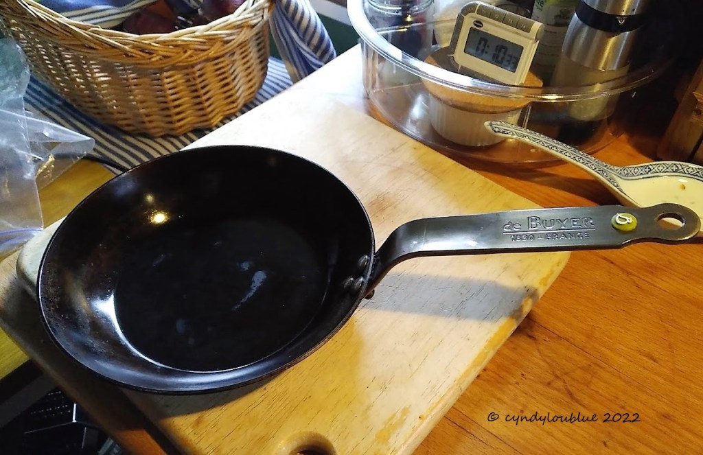 Yesterday I told you about my cast iron skillet and what a wonderful thing it is for most sorts of cooking that need a skillet. Here is different type and, just like the cast iron pan, this one comes off the wall most days but for different tasks. It is a 20 cm solid iron pan made by the de Buyer company in France and I have had it for about 10 years now. They are easy enough to get hold of and can be found on Amazon for about £40. Shop around. I think I got mine at TK Maxx or Homesense and didn’t pay that sort of money for it. I love a bargain, especially when I know I am going to use something and it is going to last.
