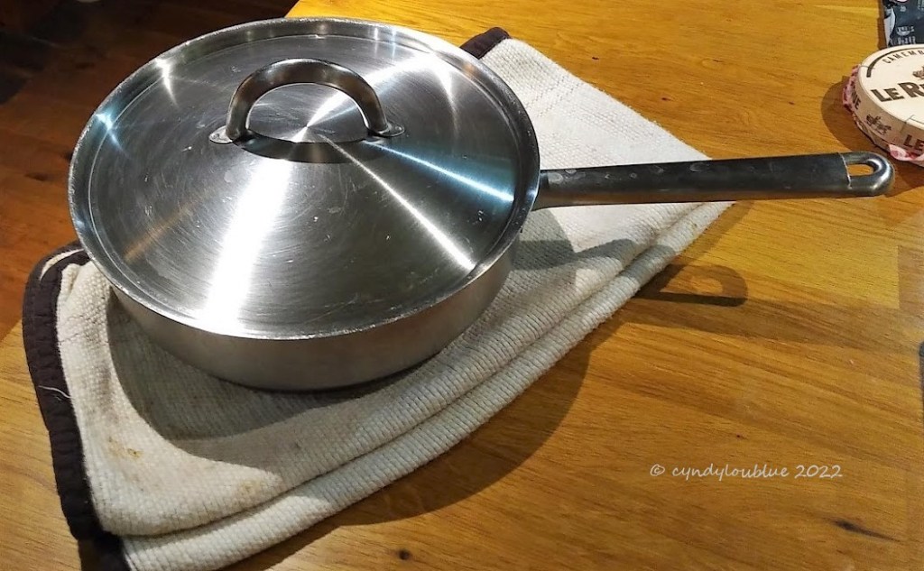 The third in my triumvirate of favourite skillets is this one. I think I bought it from Ikea in the 1980s. It measures about 25cm across the top- that’s about 10 inches for my fellow oldies out there. The lid also does double duty on my cast iron skillet. So, why have three skillets?