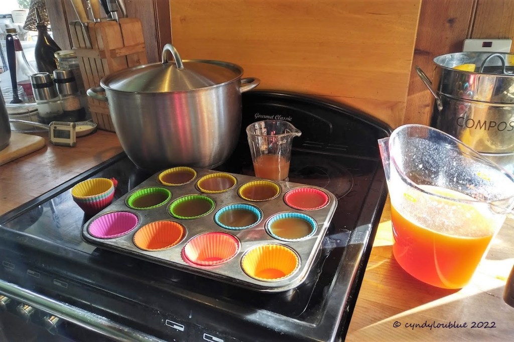 • When the reduced stock is cool, I pour it into the silicone cups as shown and freeze the whole pan until solid. Pop out the little frozen stock cubes into a plastic freezer bag and and keep that in the freezer to grab a “stock cube” or two as needed. Reducing the stock concentrates the flavour so that using them in this way doesn’t add too much liquid to a recipe. I often put a couple of these blocks in a mug with a bit of salt and added hot water for an almost instant cup of warming broth that sooths the soul and often sees off the start of a cold.