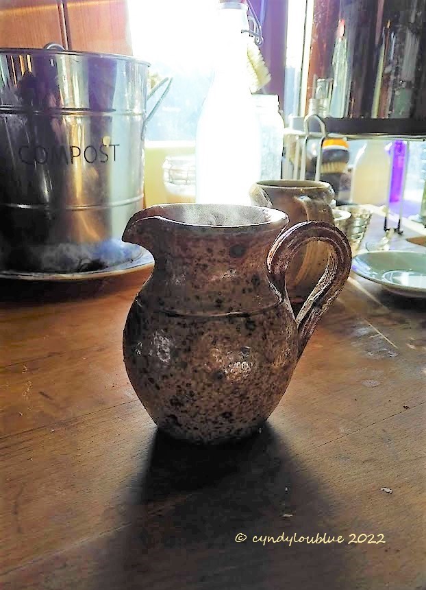 I had forgotten about this photo. It was taken a couple of weeks ago as the morning light poured into the kitchen. I love the way that the light bounces off of different things in the kitchen, lighting up the front of the jug although the only light source is coming from behind. I don’t stage my photos as I really like the spontaneous beauty in realism that surrounds us all the time, if we look. Muck on the counter top, who cares? Really? Yes, they get wiped several times each day – we all have dirt but like to pretend we don’t. “Clean enough to be healthy, messy enough to be happy.” My Mom.