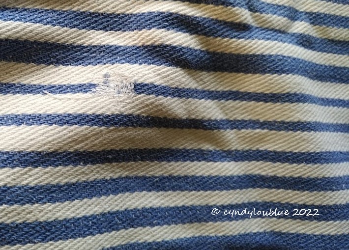 I am determined to get as much life out of them as I can and I still love the blue and white stripes. And I am also strange enough to quite love the little repairs. What can I tell you? The Wabi-Sabi thing again.