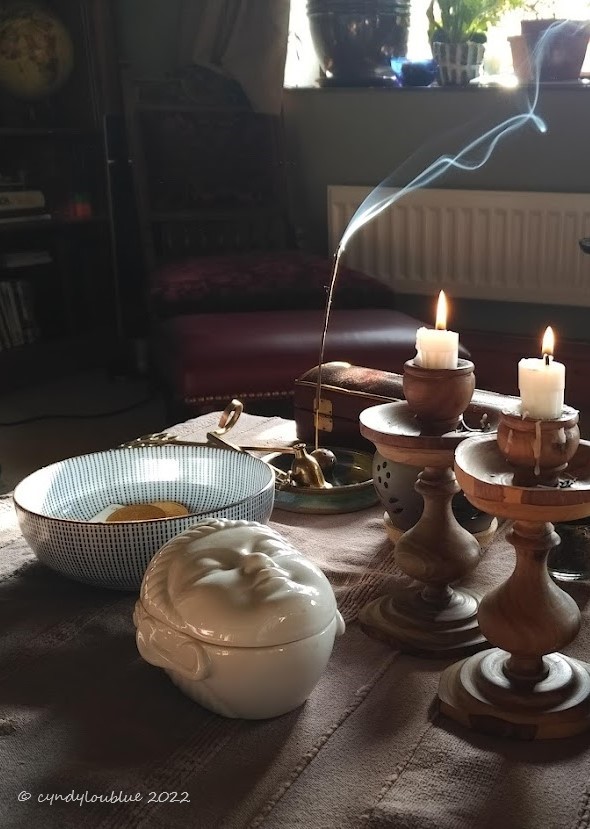 The little burner and the incense that went with it were the start of a ritual for me that plays out all over my house. I like to create little places of repose here and there, places where I can just sit and ponder for a few moments, think and breathe. While deeply spiritual, I would not say they are meant to be religious places in any way. They are just little vignettes that encourage stillness. Stillness and quiet are where I find the Spirit inside of me.