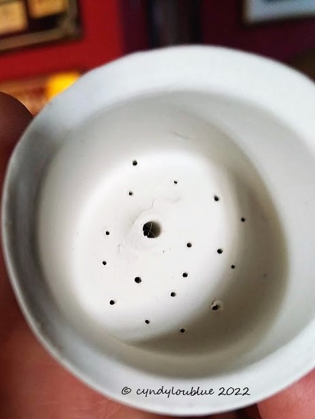 Not only is it a thing, but it is a proper, beautifully hand-made, ceramic thing and comes in dozens of whimsical shapes. 47 different shapes are listed on her website. The website also explains that the maker’s mother had experienced the same problems we have always encountered with the blessed fruit flies and set about making a solution to the problem. The lady actually makes quite beautiful ceramics of all sorts but I have a feeling that the world is going to fall in love with these little wine breathers. Here’s a picture of the bottom: