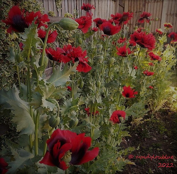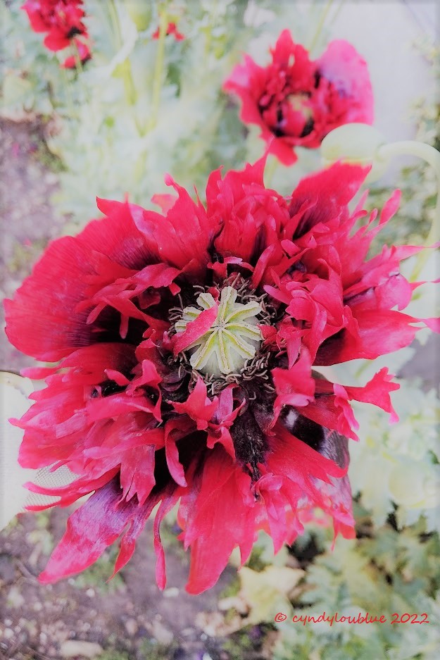 He has learned not to mess with my resolute procrastination and the poppies were left to bloom. And…here they are. Last year I had pulled up all the boring ones as soon as the first bloom gave me a hint of what it was like. I left the rest to go to seed and scattered the most deeply cut blooming ones around in the bed.