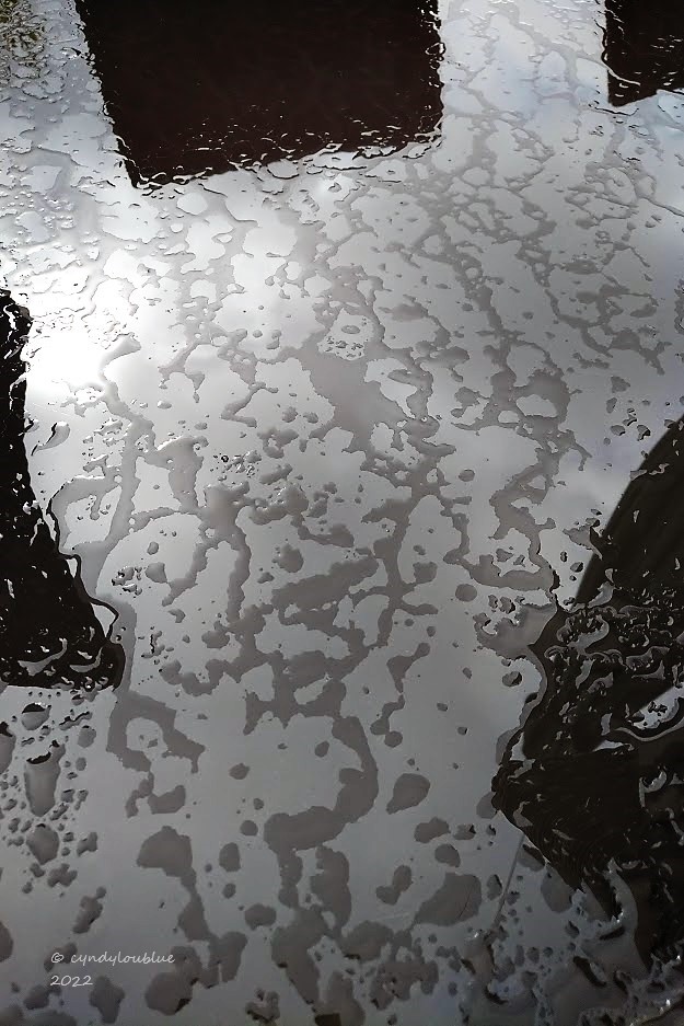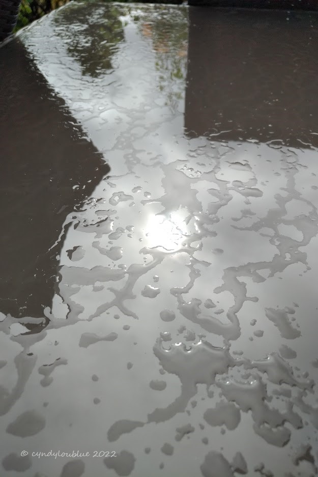 The rain puddling on the glass top of the patio table creates unrepeatable patterns and plays with the sun peaking out from behind the clouds.