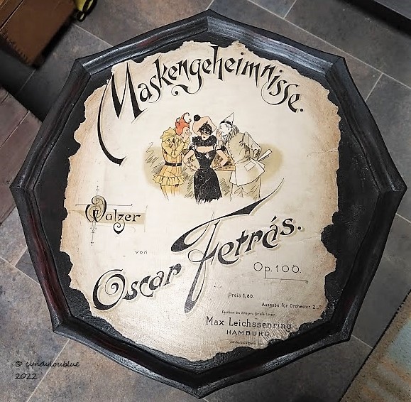 An antique music cover, well past its prime and already dog-eared, was used here in a Chalk Paint, decoupage and wax treatment and I was happy enough with the outcome. My friend seemed to like it.