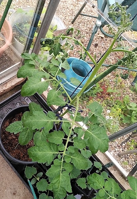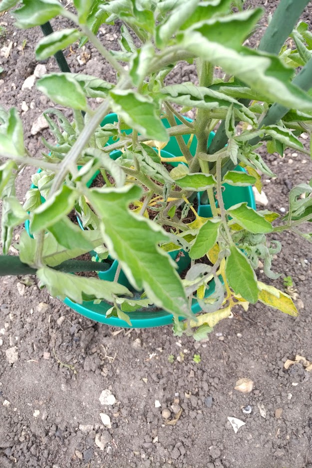 I am growing my tomatoes, as I have done for years now, in buckets of tomato compost from a grow bag. I never feel that grow bags, even “giant” ones, have quite enough room for the roots. This is a well-known product purchased from my local gardening centre- “Giant” red tomato grow bag, starts with TOMO….worst stuff I have ever seen. I also used some of it to plant tomatoes in the garden in “crowns”- the green plastic things that people use in growbags. Here is a picture of one of those…