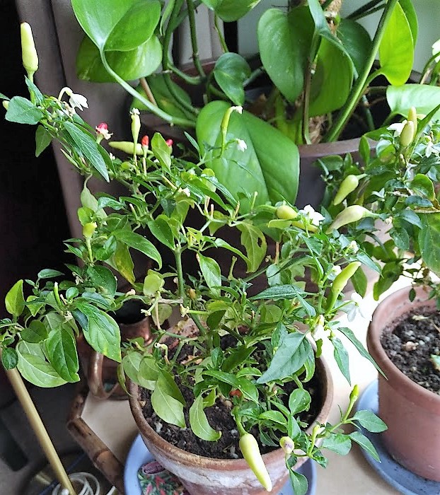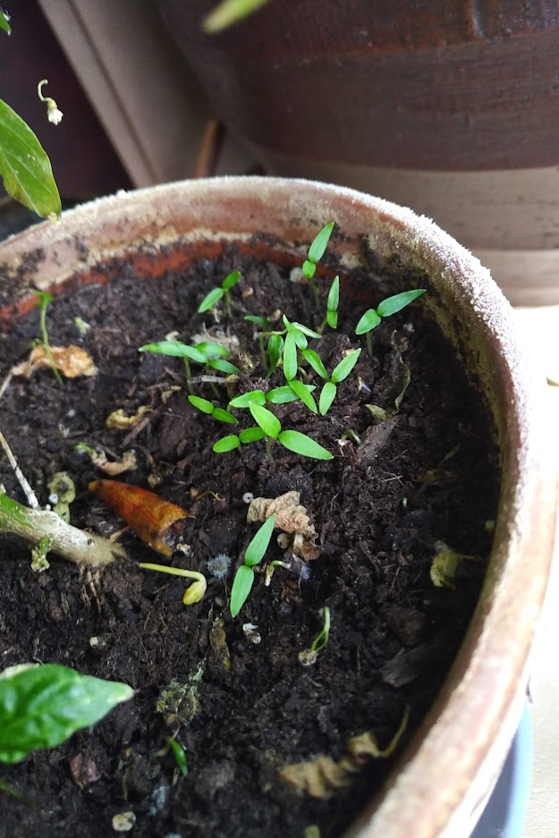 And here are the baby chili plants that are coming up under their parent plant: