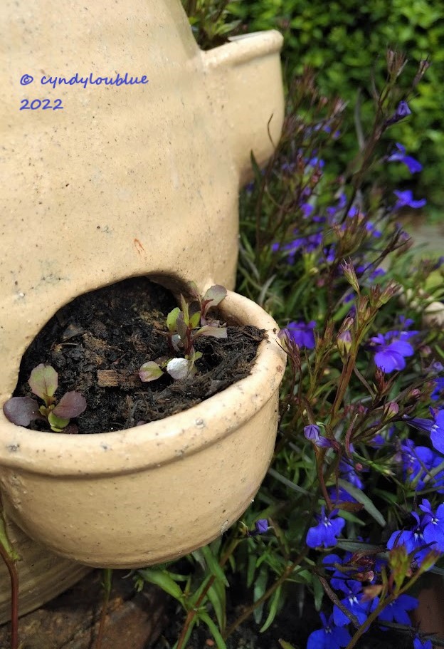 In several of the little cups, lobelias had either self-sown their seeds, which I am happy to report that they do quite happily, or the roots had over wintered. I shall let the little chaps carry on now that they have worked this hard to get here.