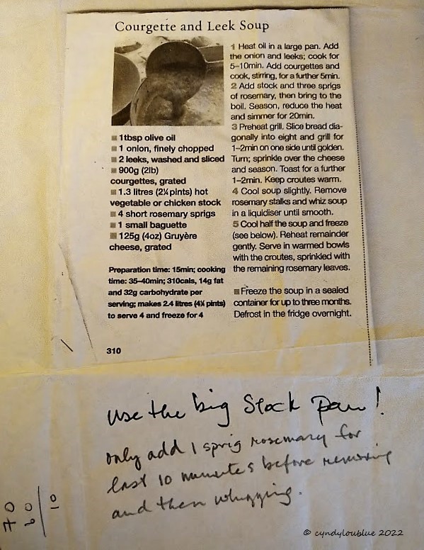 I am sure we all have a recipe such as this one tucked away somewhere. It is a photocopy of a photocopy, but it is my favourite. And I do love a place to scrawl afterthoughts and inspirations! I must say I never get as far as the toast and cheese part of the recipe. It’s an extra faff and it is perfectly fine without it. And the later handwritten addition about the rosemary works much better for me. The other way was a bit all about the ROSEMARY and not about the rest of it.